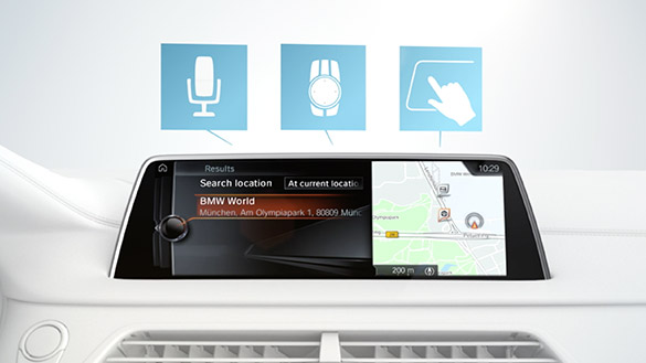 Com o sistema de controlo por gestos da BMW podem ser selecionadas funções específicas através de movimentos com as mãos. Simples gestos como “passar o dedo pelo ecrã” ou “indicar com o dedo” são identificados na área de reconhecimento, por exemplo aceitar ou rejeitar telefonemas, ou movimentos circulares com o dedo indicador para ajustar o volume de som.