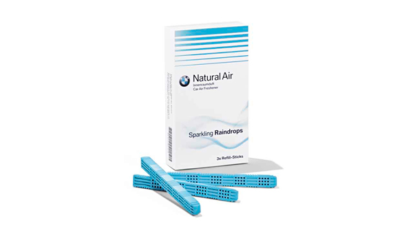 O kit de recarga BMW Natural Air para o suporte do ambientador inclui três sticks com o aroma "Sparkling Raindrops".
