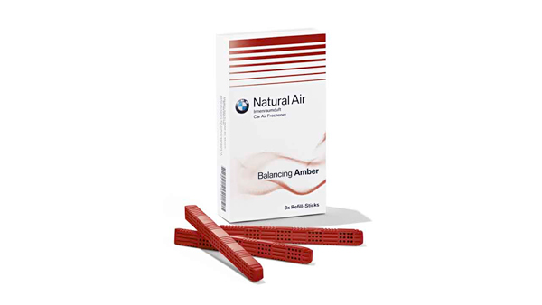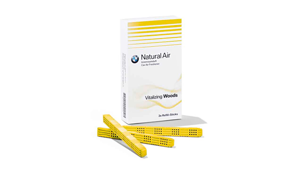 O aroma dos sticks de fragrância do kit de recarga de edição limitada Fascinating Roots lembra camurça nobre, combinado com notas quentes de madeira e especiarias. O kit inclui três sticks de fragrância embalados separadamente, que podem ser muito facilmente inseridos no ambientador do kit básico BMW Natural Air.