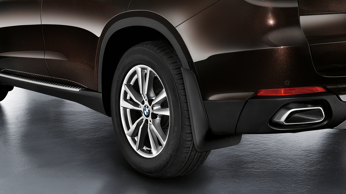 Os robustos para-lamas pretos protegem de sujidade e gravilha oo seu BMW, bem como o veículo que segue atrás. Acentuam a imagem marcante da BMW e realçam de forma impressionante o caráter todo-o-terreno.